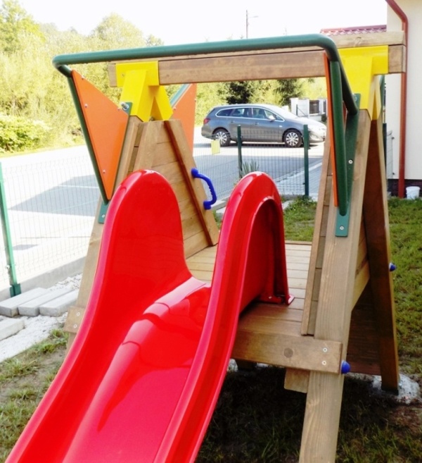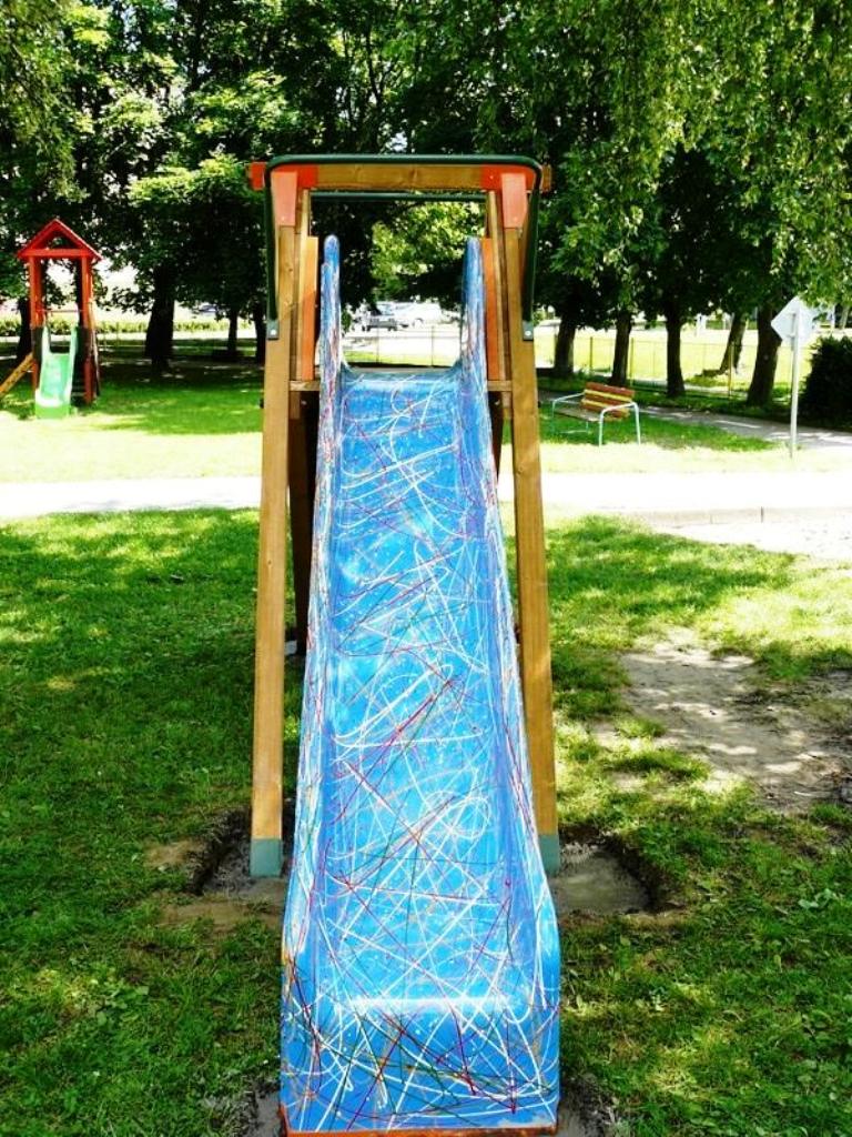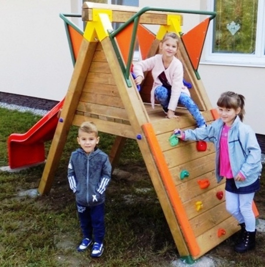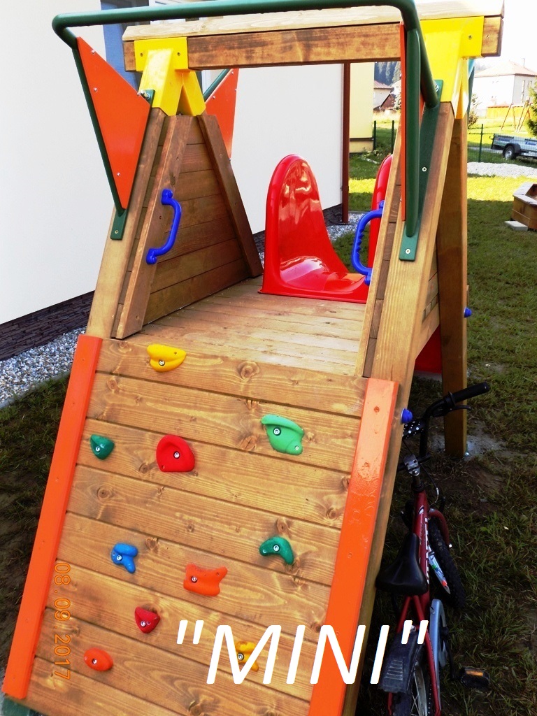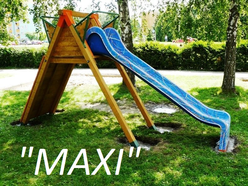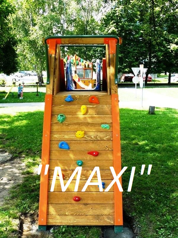 Šmykľavková preliezka "2A Maxi 150". Projektovaná výška pádu - 1,6 m. Potrebný je aj tlmiaci povrch(štiepka,guma).Rozmer lezeckej steny je 100x170cm. Obsahuje 12 lezeckých chytov. Pôdorys zariadenia : 100 x 450cm. Potrebný priestor aj s ochrannou zónou: 4m x 6m.